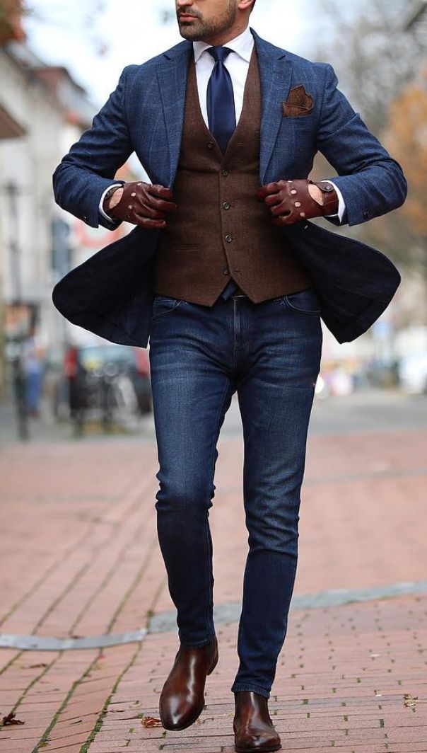 زیبایی استایل خود را با استفاده از کراوات مشکی و پوشت سفید به همراه بوت تکمیل کنید. یک روش راحت‌تر برای پوشیدن بوت‌های چلسی این است که بوت‌های چلسی قهوه‌ای را با یک کت و شلوار سرمه‌ای بپوشید. یک پیراهن صورتی کم‌رنگ دکمه‌دار هم به زیبایی استایلتان می‌افزاید.