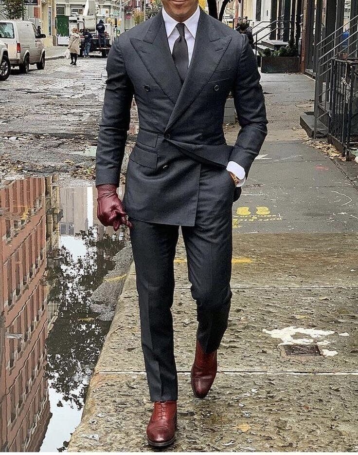 بوت های مشکی، قهوه ای یا قرمز تیره توصیه می شود. برای کت و شلوار خود، سبک کلاسیک را انتخاب کنید و آنها را با یک پیراهن سفید یا کراوات خاکستری ست کنید.